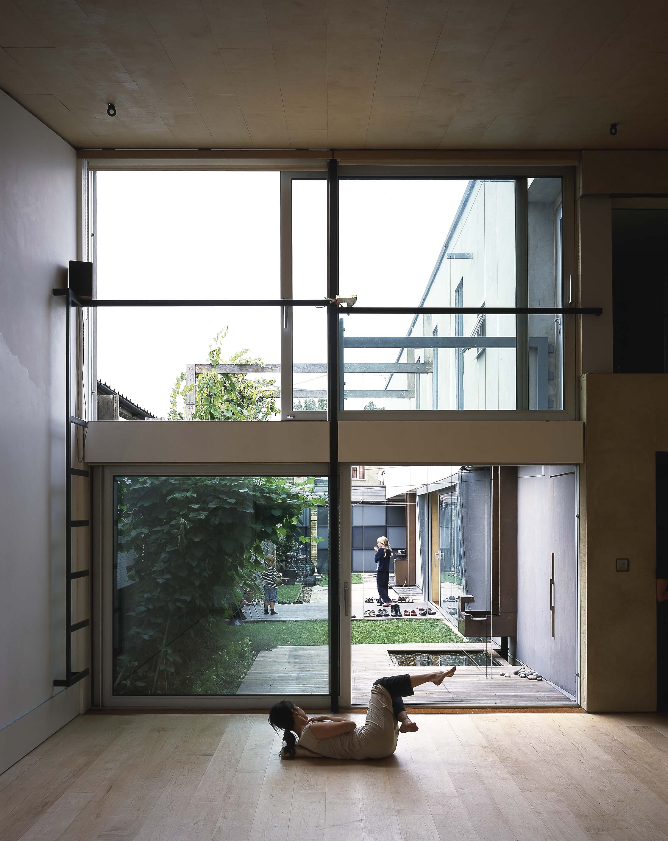The h8.4 x 7.6m studio, designed by Moving Architecture, has a double height glazed wall providing excellent natural light and access to a private courtyard garden. 21 years on, the wonderful floor keeps springing, a testament to the design innovation of the late Tim Heale. The ceiling is a mono-pitch rising from 3m to 6.5m toward the large windows with rigpoints fixed across the space for aerial practice, the heightest 5.4m and the midpoint 3.7m